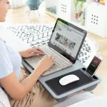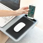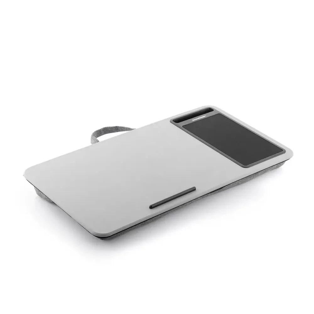 Scrivania portatile per laptop con comodo cuscino integrato nella base di appoggio, ideale per lavorare comodamente ovunque. Il vassoio superiore rigido offre un ampio spazio di lavoro con presa ferma e stabile, includendo un pratico tappetino per il mouse (12,5 x 22,5 cm) e una fessura di supporto per smartphone (12,5 x 2 cm).