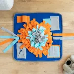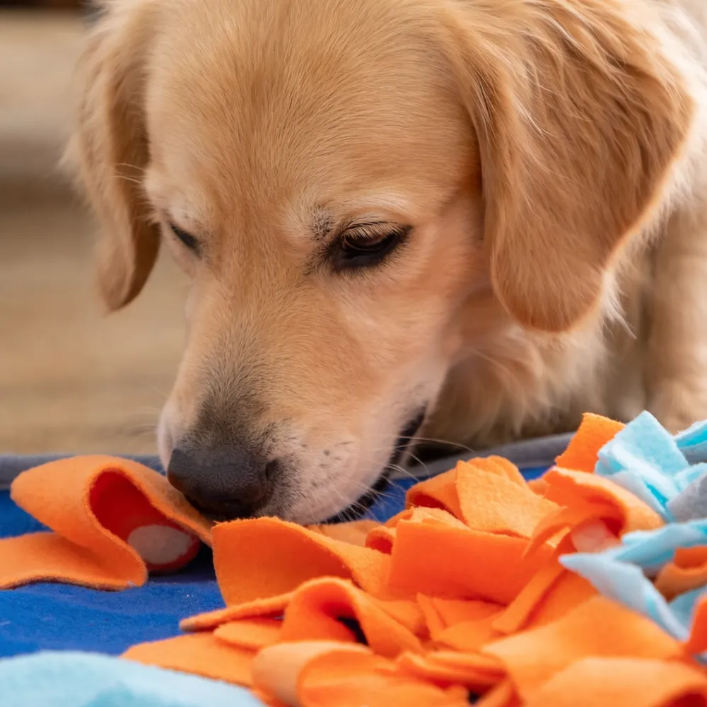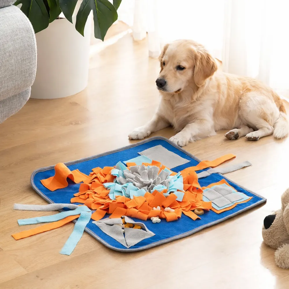 Il tappeto olfattivo interattivo è progettato per nascondere crocchette e premi tra le sue frange morbide, stimolando l’olfatto e l’istinto naturale di ricerca del cibo.